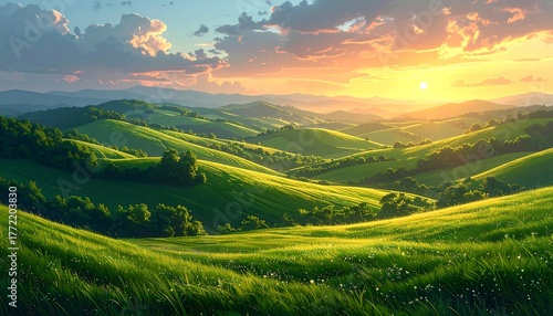 Fototapeta premium Rolling green hills bathed in golden sunlight at sunset. Wispy clouds dot the...