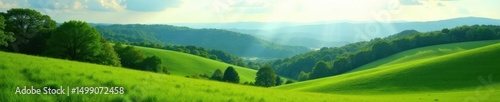© Rachanon, Fototapeta premium Rolling green hills, distant forest, bright daylight, vegetation, sky, sunlight
