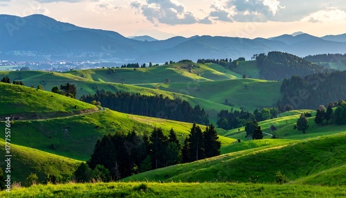 © Goyonjung, Fototapeta premium Rolling green hills dotted with trees, under a cloudy sky, with distant mountains providing a serene backdrop