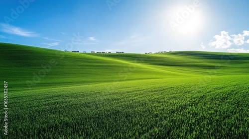 © Ghiska, Obraz premium Rolling green hills landscape on sunny day blue sky serene nature scenery