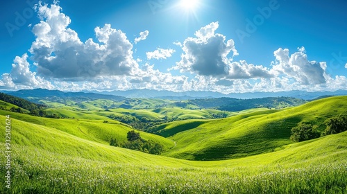 Fototapeta premium Rolling Green Hills Landscape with Blue Sky and Sun