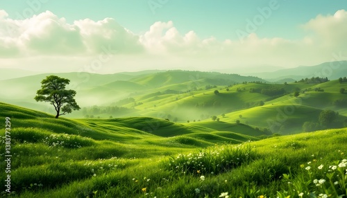 © Umma, Obraz premium Rolling Green Hills Landscape With Lone Tree And Wildflowers Under A Tranquil Sky