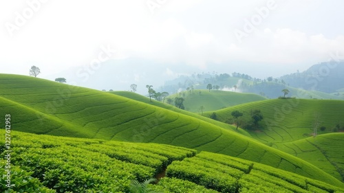Fototapeta premium Rolling green hills of tea plantations with misty mountains in the...