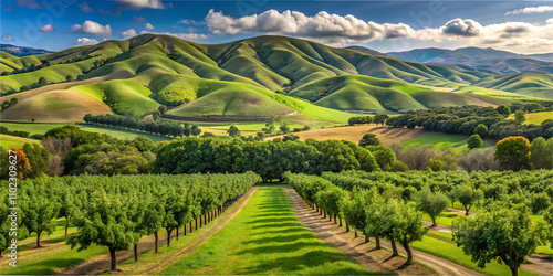 © Roman, Fototapeta premium Rolling green hills offer a stunning backdrop to a peaceful orchard filled with rows of fruit trees. The sky is bright with scattered clouds, enhancing the natural beauty