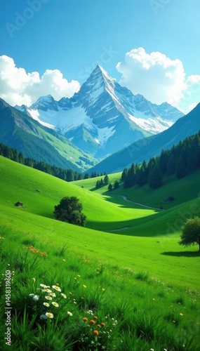 Naklejka premium Rolling green hills, snow-capped peaks in background , environment, mountain,...