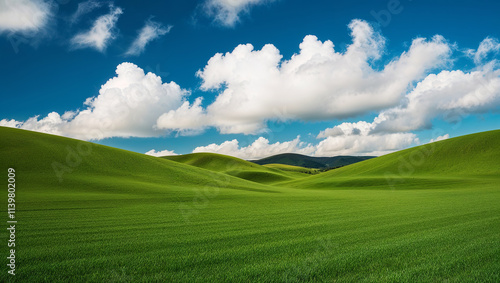Fototapeta premium Rolling green hills stretching under a cloudy blue sky
