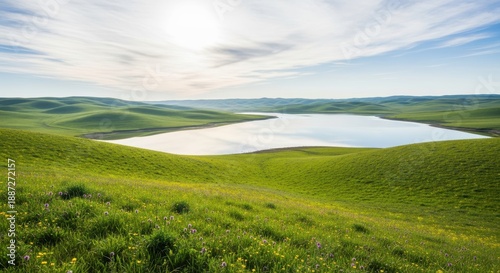 Fototapeta premium Rolling green hills surround a calm body of water under a bright sky