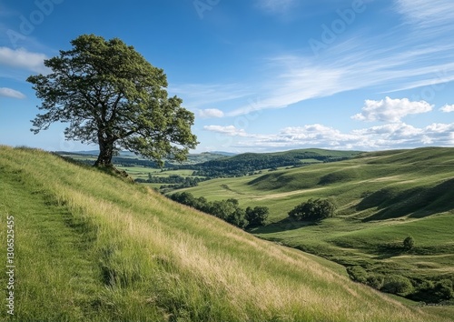 Naklejka premium rolling green hills under a blue sky, with a single tree as a focus point...