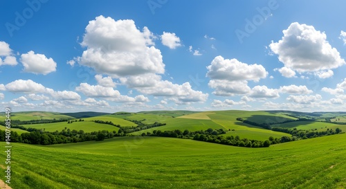 Obraz premium Rolling green hills under a blue sky with fluffy clouds, rural countryside...