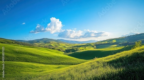 © Penatic Studio, Obraz premium Rolling Green Hills Under a Blue Sky with Puffy White Clouds