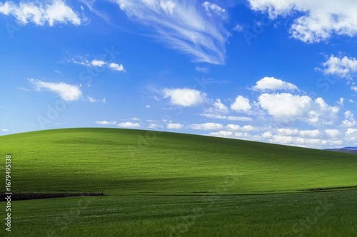 Fototapeta premium Rolling green hills under a bright blue sky, sunny day, pastoral landscape,...