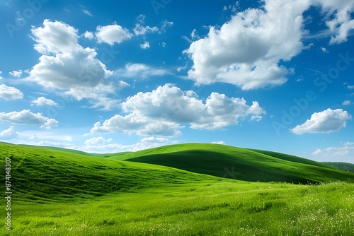 Fototapeta premium Rolling green hills under a bright blue sky with scattered fluffy clouds, a...