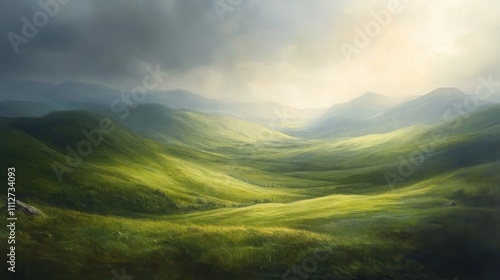 © Andre Jovi, Fototapeta premium Rolling Green Hills Under a Cloudy Sky