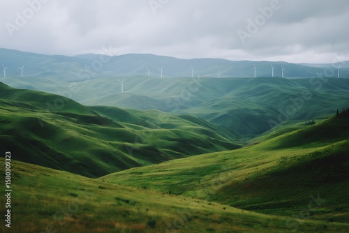 Fototapeta premium Rolling green hills under a cloudy sky, powered by wind turbines in a renewable energy landscape