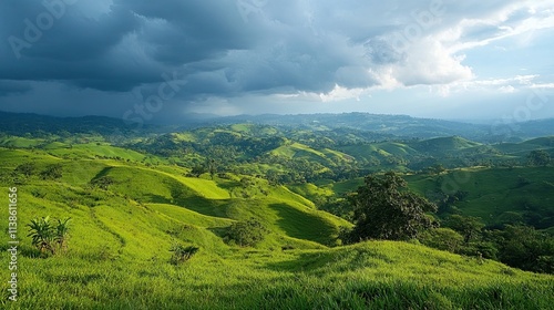 © Shehzad, Obraz premium Rolling green hills under a dramatic cloudy sky.