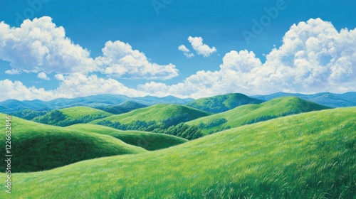 © muhammad, Obraz premium Rolling green hills under a summer sky, pastoral scene