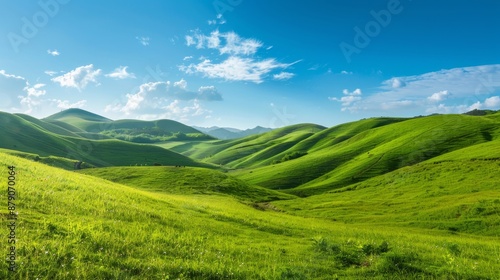 Naklejka premium Rolling Green Hills Under Blue Sky.