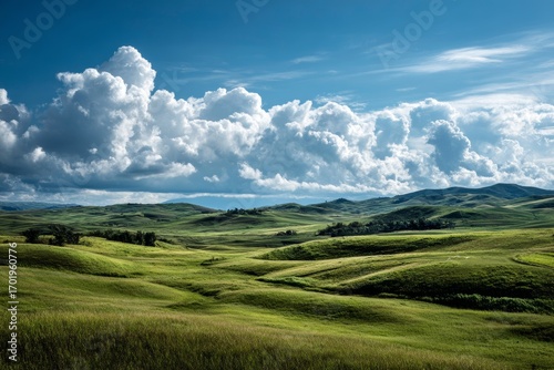 © CogniLens, Fototapeta premium Rolling green hills under blue sky with fluffy clouds