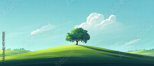 Fototapeta premium Rolling green hills with a single tree under a clear blue sky