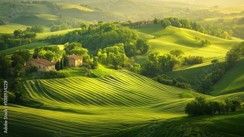Fototapeta premium Rolling green hills with a village nestled in the valley, lit by the golden...