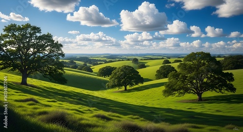 Obraz premium Rolling green hills with large oak trees under a blue sky