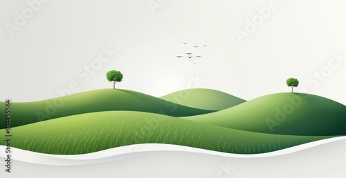 Obraz premium Rolling Green Hills with Lone Trees and Birds