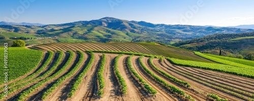 © Manatchaya, Fototapeta premium Rolling green hills with neatly planted crop rows under a clear blue sky and distant mountains.
