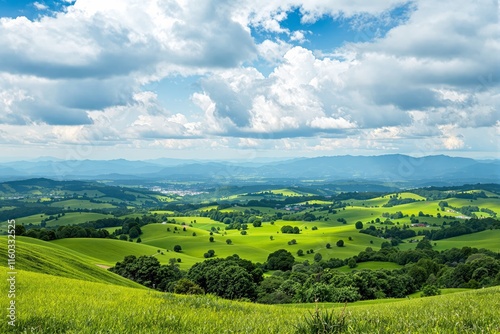 Fototapeta premium Rolling green hills with trees under a vibrant blue sky filled with fluffy...
