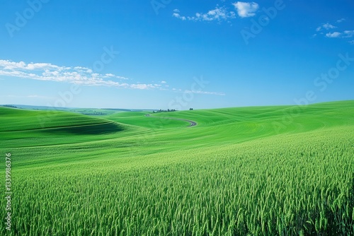 © Abba, Obraz premium Rolling green wheat fields stretch under a clear blue sky with a few white clouds. Use this peaceful image for travel brochures or environmental projects.
