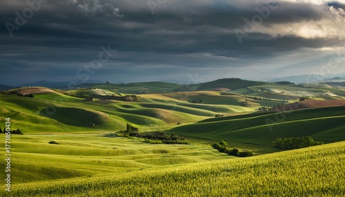 Obraz premium rolling hills and fields under a dramatic sky