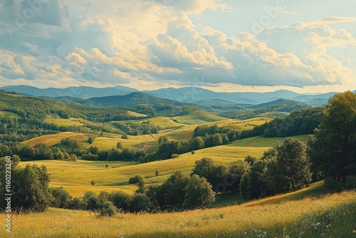 © kardaska, Obraz premium Rolling hills and lush green fields creating a breathtaking summer landscape