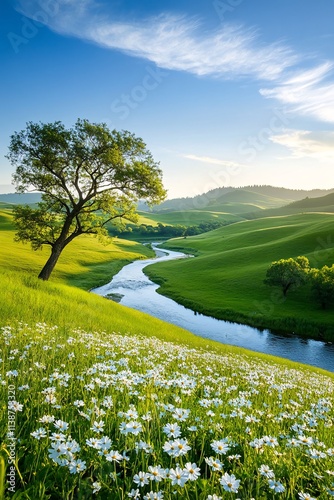 © atdigit, Obraz premium Rolling Hills and Tranquil River Under a Clear Blue Sky with Blossoms
