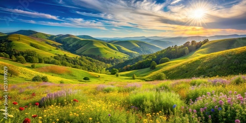 © Praphunsak, Obraz premium Rolling hills covered in dense foliage and wildflowers under a bright sunny day
