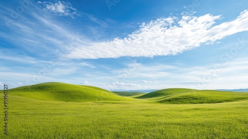Obraz premium Rolling hills covered in green grass, beneath a clear blue sky with scattered...