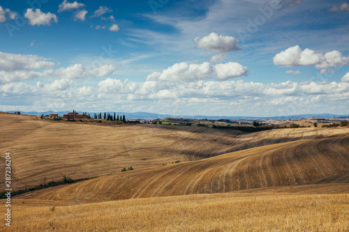 © belyaaa, Fototapeta premium Rolling hills in autumn after harvest.