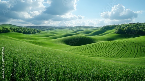 © RONNY, Fototapeta premium Rolling Hills Lush Green Field Sunny Day