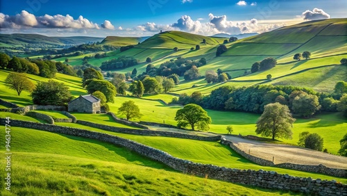 Fototapeta premium Rolling hills, lush green meadows, and rustic stone walls evoke a sense of...