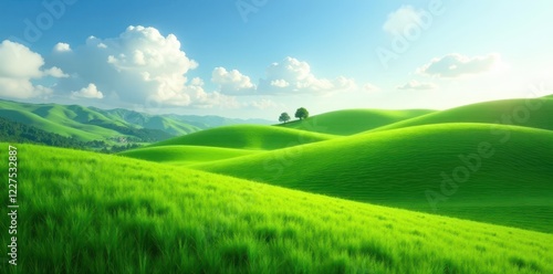 Naklejka premium Rolling hills of emerald grass, peaceful scene , sunlight, farmland
