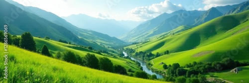 © Maneerat, Fototapeta premium Rolling hills of emerald green, with a meandering river, pyrenees mountains, mountains