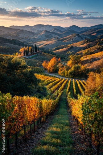 Naklejka premium Rolling Hills of Napa Valley Vineyard at Sunset, Golden Vineyards and Distant Mountains