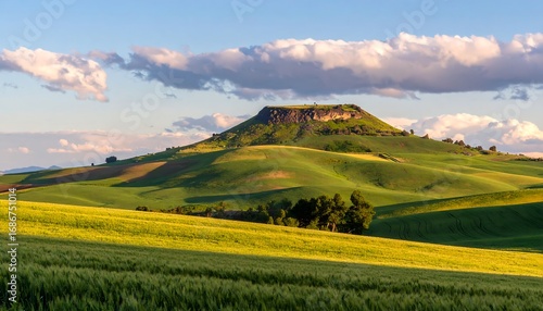 © Arifyoga, Fototapeta premium Rolling hills, sunlit fields, and a flat-topped mountain under a partly cloudy sky