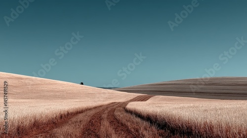 © UnderTheSun, Fototapeta premium Rolling hills under a clear blue sky create a serene landscape scene.