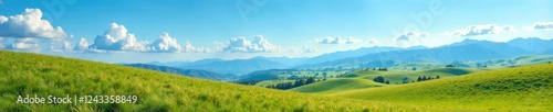 Fototapeta premium Rolling hills with distant mountains under a brilliant blue sky, open spaces,...
