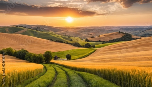 Naklejka premium Rolling Hills with Golden Wheat Fields at Sunset