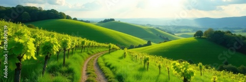 Fototapeta premium Rolling hills with lush greenery and a winding vineyard path, rolling hills, peaceful, nature