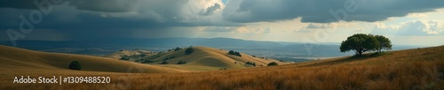 © Hugnaka, Obraz premium Rolling hills with trees against a vast plateau under a dark and cloudy sky, landscape, rugged