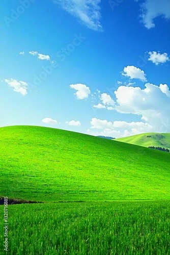 Obraz premium Rolling meadows with bright green grass against blue skies, vibrant, horizon,...