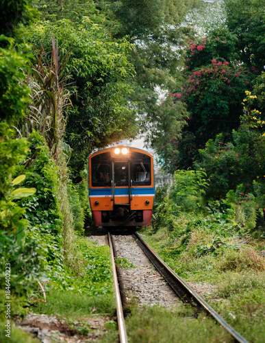 Obraz premium Rolling through lush greenery on the train tracks of Talat Phlu Bangkok