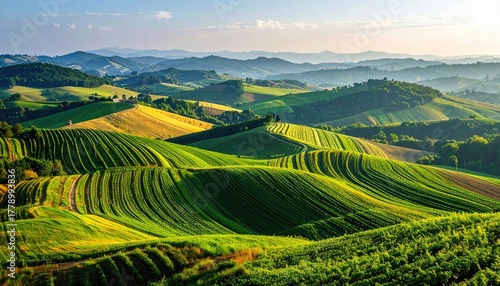 © Aluna, Fototapeta premium Rolling Tuscan Hills Covered With Vineyards And Agricultural Fields Under A Golden Morning Sun With A Hazy Blue Sky