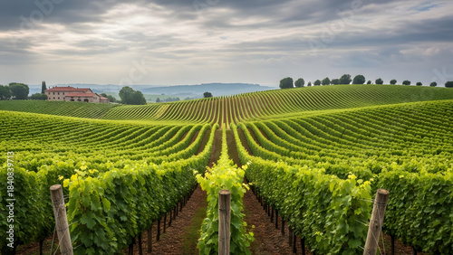 Fototapeta premium Rolling tuscan vineyard landscape under cloudy sky with distant farmhouse